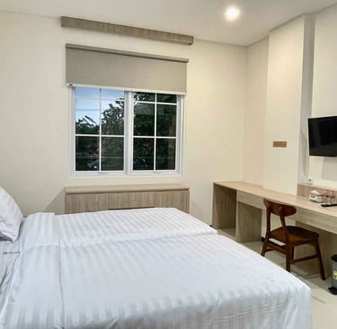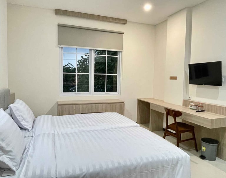 Desain kamar modern, bersih, dan rapi cocok untuk profesional, pekerja proyek, hingga traveler jangka menengah.