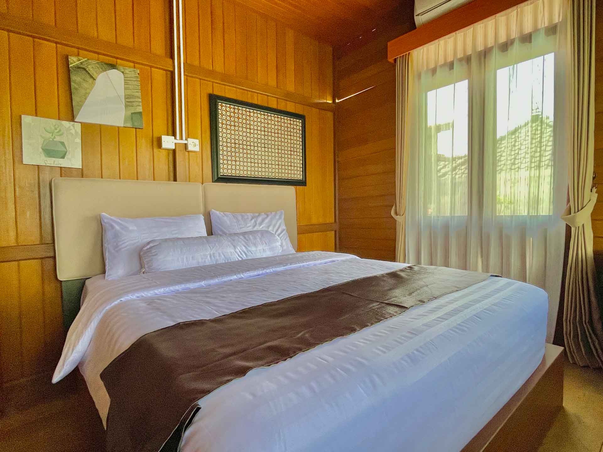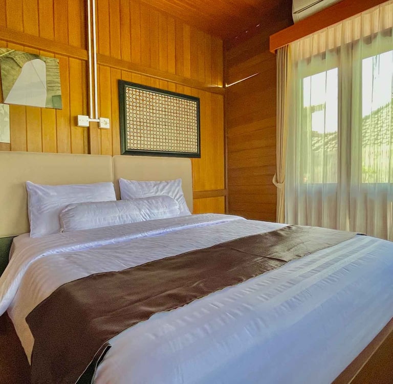 Desain kayu klasik dengan nuansa natural menciptakan suasana menginap yang tenang, nyaman, dan terasa seperti pulang ke rumah.